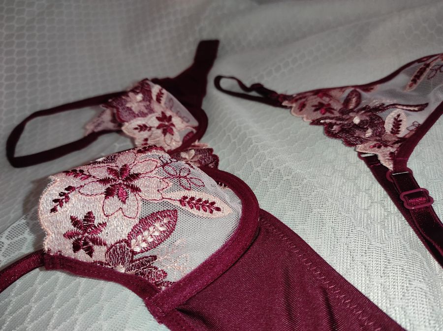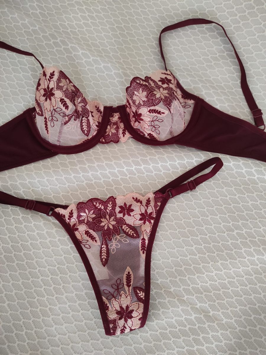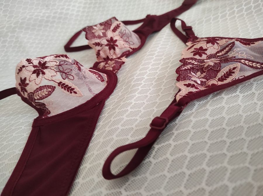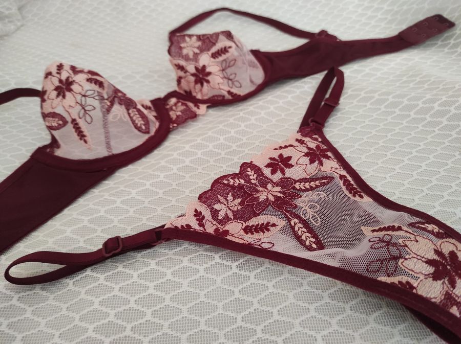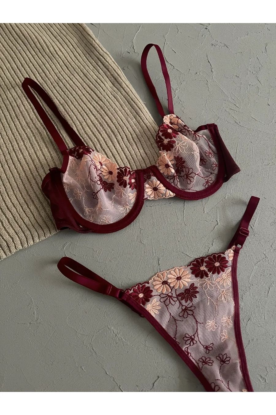 Bordo Dantelli Nakışlı Balenli Transparan Brode Bralet Sütyen Takım